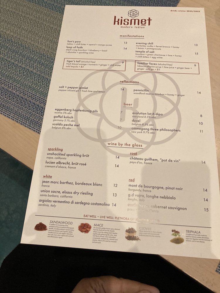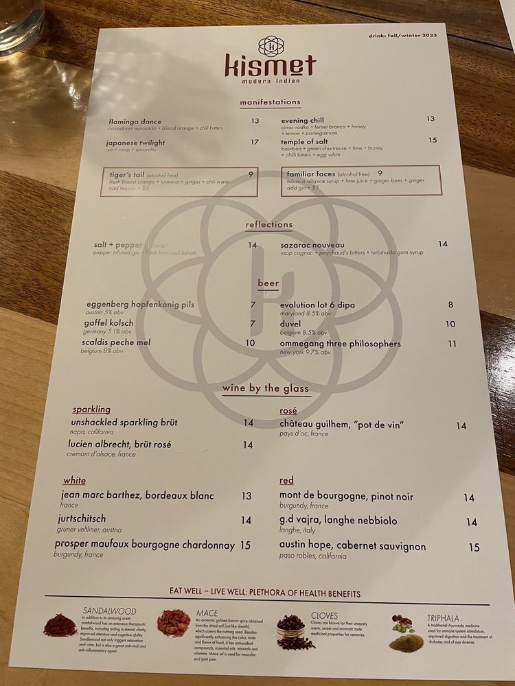 The menu at Kismet is a vibrant journey through Indian cuisine. Highlights include the Branzino Pollichatu and the butter chicken, celebrated for its creamy, aromatic goodness. For those exploring, the tandoori cauliflower and lamb seekh kebab offer a delightful start, showcasing smoky undertones and a refined spice blend.